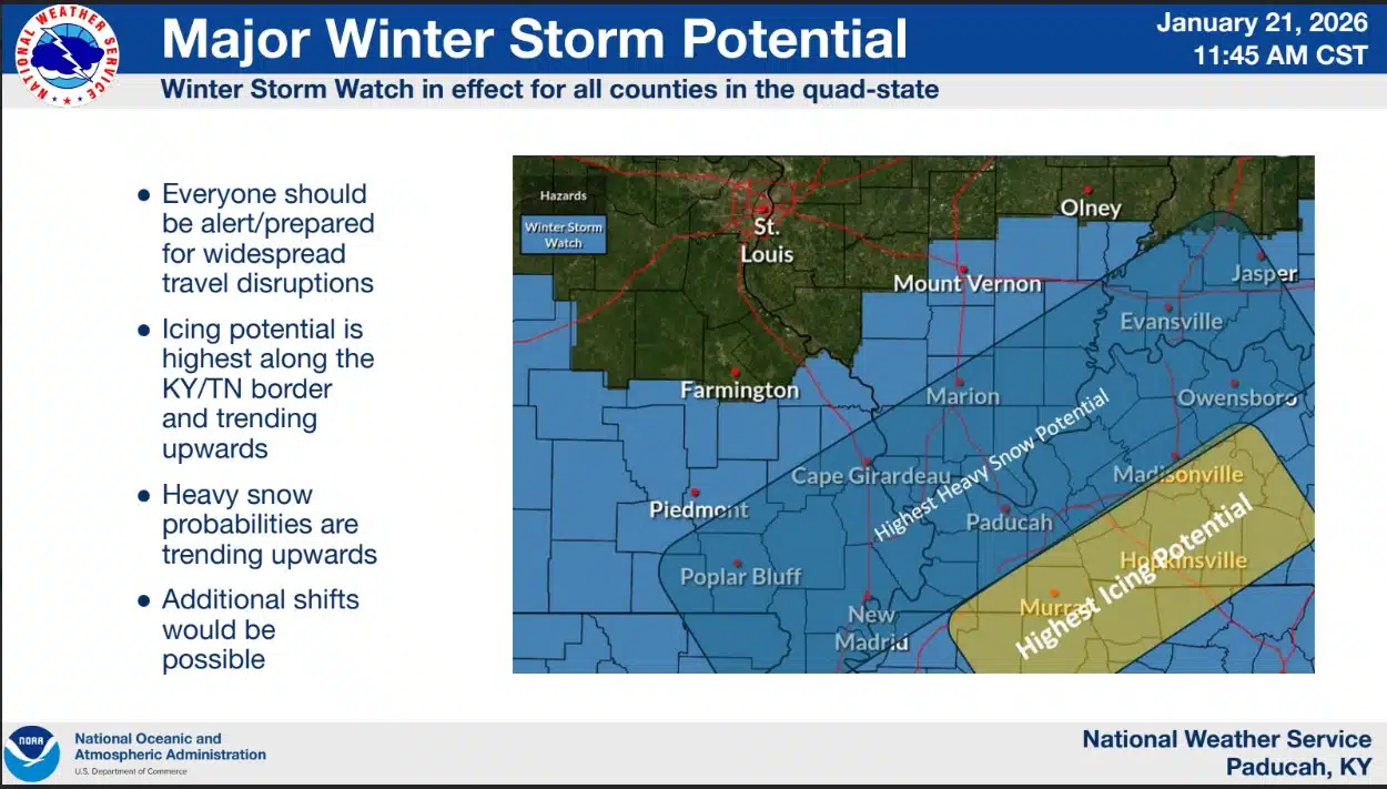 The probability of an impactful snow/winter weather event continues to trend upward steadily. The risk for some icing along the Kentucky/Tennessee border is also trending upward. There is a steadily increasing potential for very heavy snow (8 inches or more) over at least some of the region. Dangerously cold conditions will develop Friday night and persist through much of the storm. Temperatures are not expected to climb above freezing until Tuesday at the earliest. View the complete Major Winter Storm Potential briefing packet on the Paducah National Weather Service Website: https://www.weather.gov/pah.